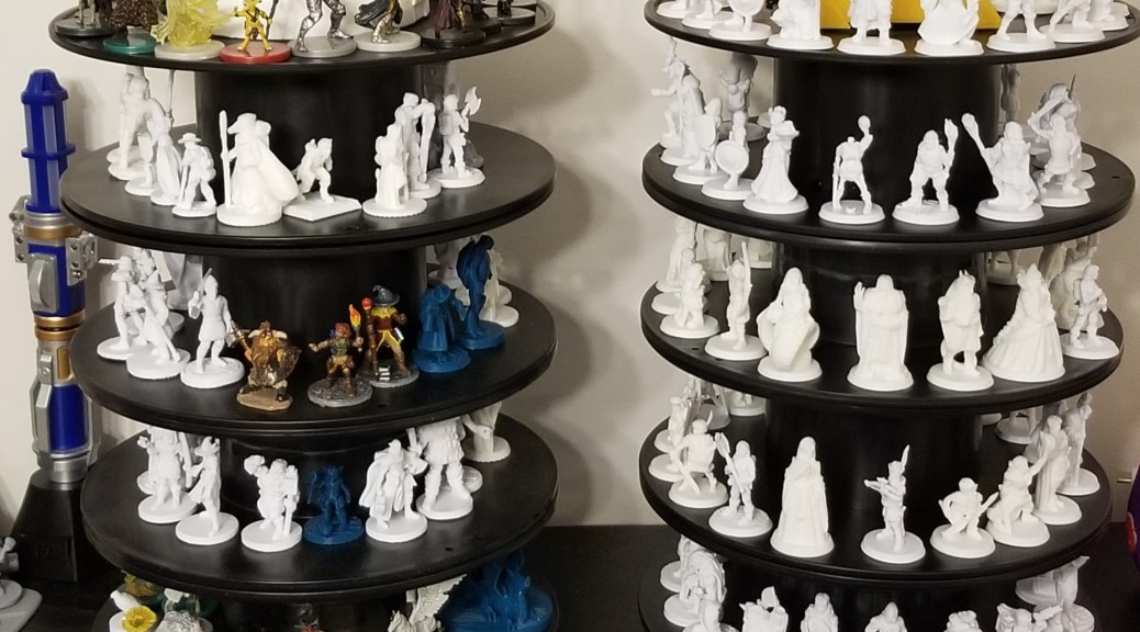 I’ve been putting the finished off spools to good use, as shown in the cover image for this post. I have a second miniatures tower on a turntable to more neatly store my minis. At this rate of minis production lately, I may have to make a third when I have the spools. And I should probably learn how to paint minis at some point…