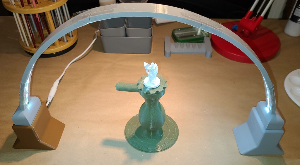 I decided to build something I had seen before on Thingiverse, an arch of LEDs providing light from various angles simultaneously, hopefully reducing the need to move a light around periodically while painting and photographing.