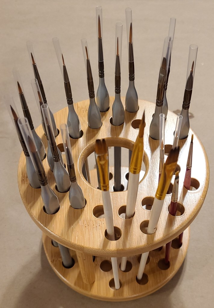 I also wanted to see what additional brushes I had available. I couldn’t leave them just lying out on a flat surface as they could roll off or I could damage them by putting something on them, so I finally added a rotating brush stand.