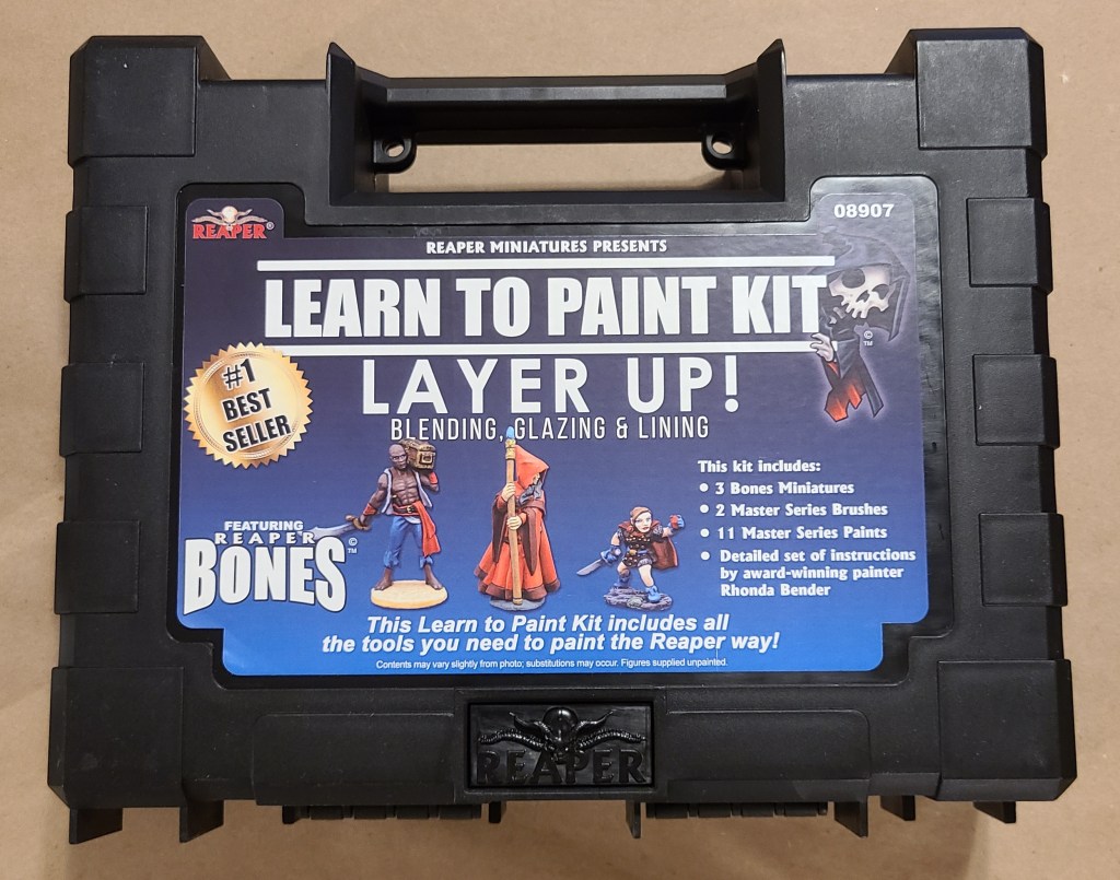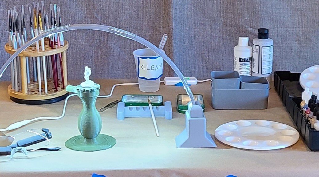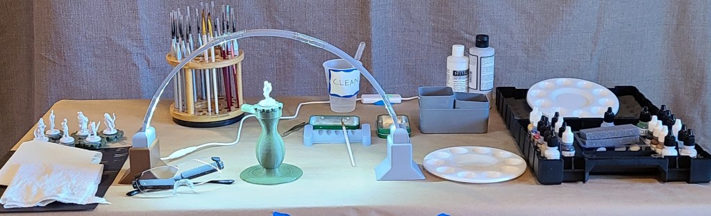 I finally got around to deciding to paint my 3D printed miniatures, so I needed to tool up and learn painting skills. That all started with a learn to paint kit, some brushes, and lighted magnifier glasses that I received as gifts.