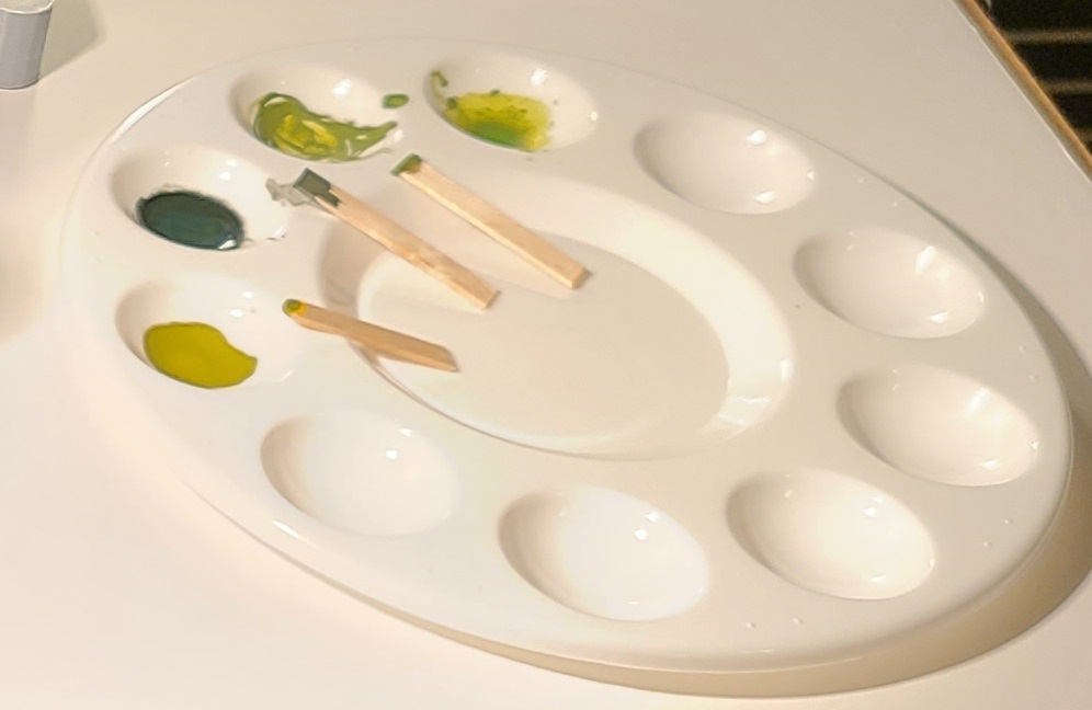 The painter’s kit recommended using kitchen parchment paper for mixing paints, but that got old fast. The parchment paper had to be cut into sections to be useable (yes I know that’s spelled weird, I don’t like standard spelling of “usable”), and it kept curling, making the paint run. I ordered some circular plastic paint palettes, and they work much better.