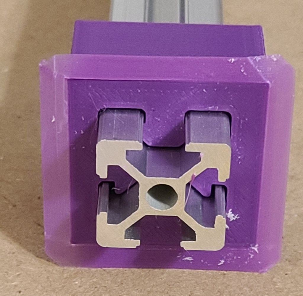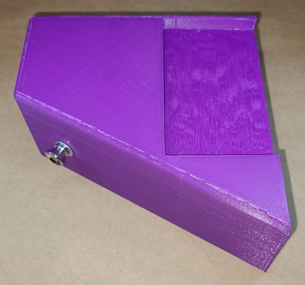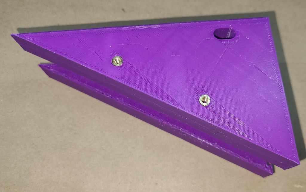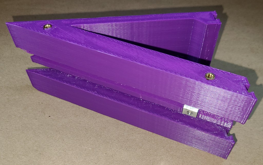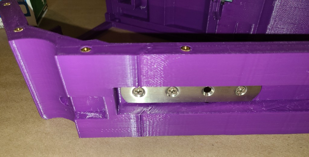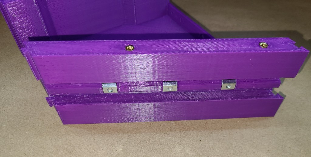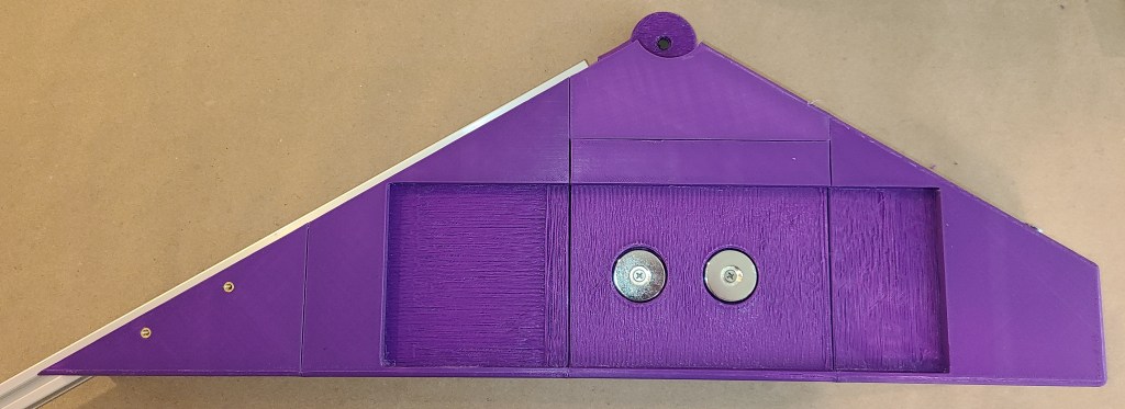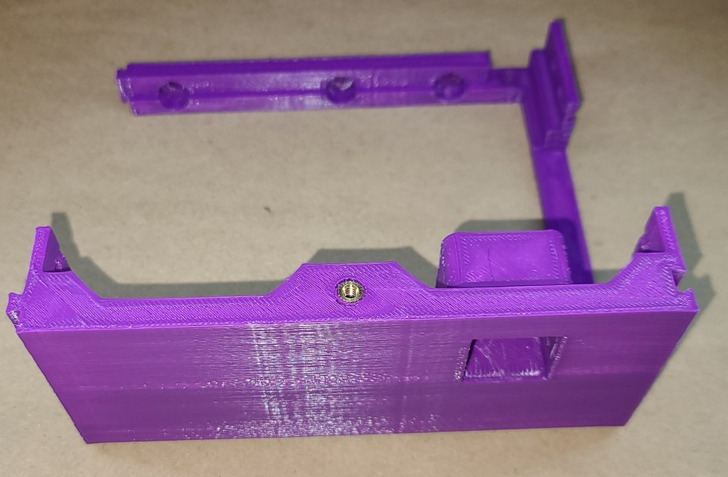 This section’s primary features are the connections for the latch, the plastic section designed to slide into the 2020 extrusion, and the added t-slot nut to allow to clamp solidly to the extrusion.