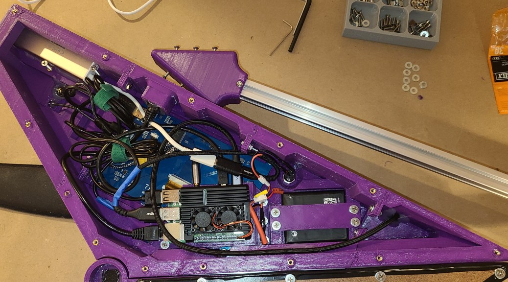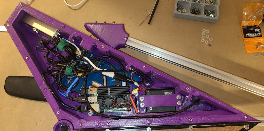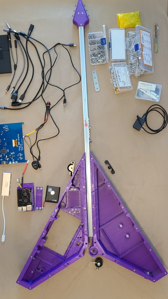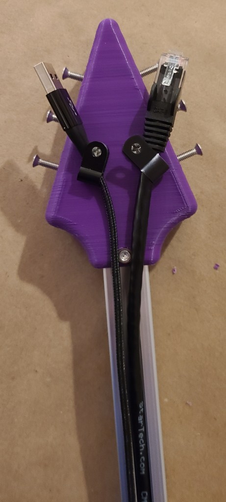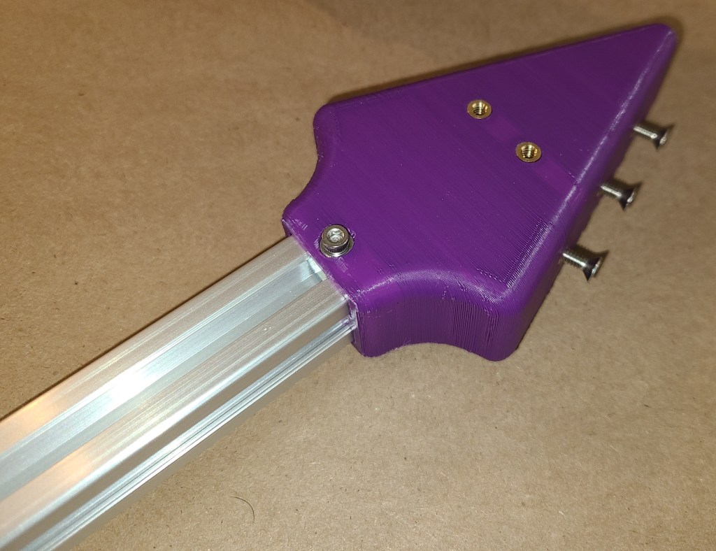 I modelled 2020 extrusion in CAD in order to use offsets to create interfacing components. This was included in various forms in the guitar head and the keyboard body. I also left spaces for t-slot nuts to attach to the neck. I put in screws in place of tuning pegs. Eventually I’m considering some changes such as thickening the head (to better support the monitor) and adding some decorative (or functional) fake tuning pegs, perhaps with SD cards in them.