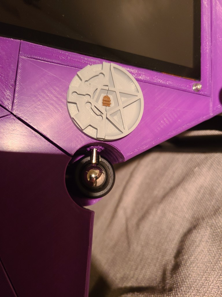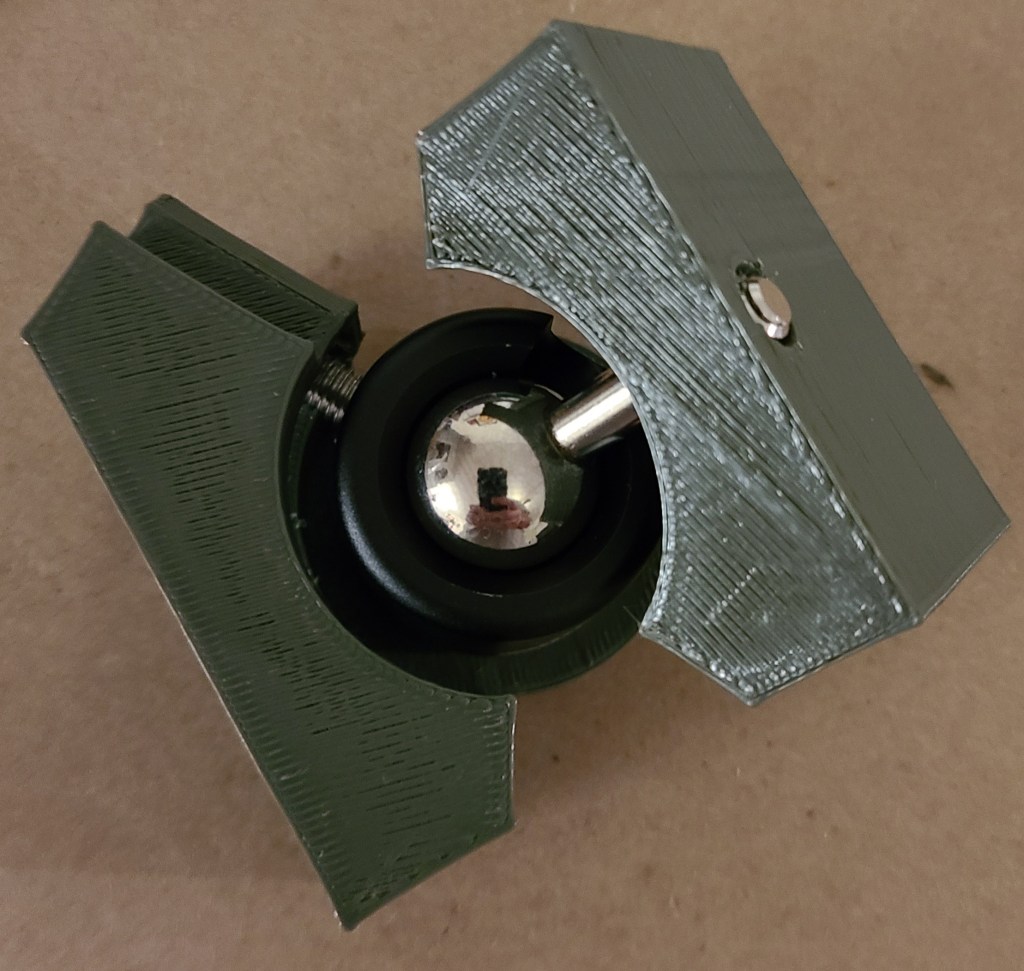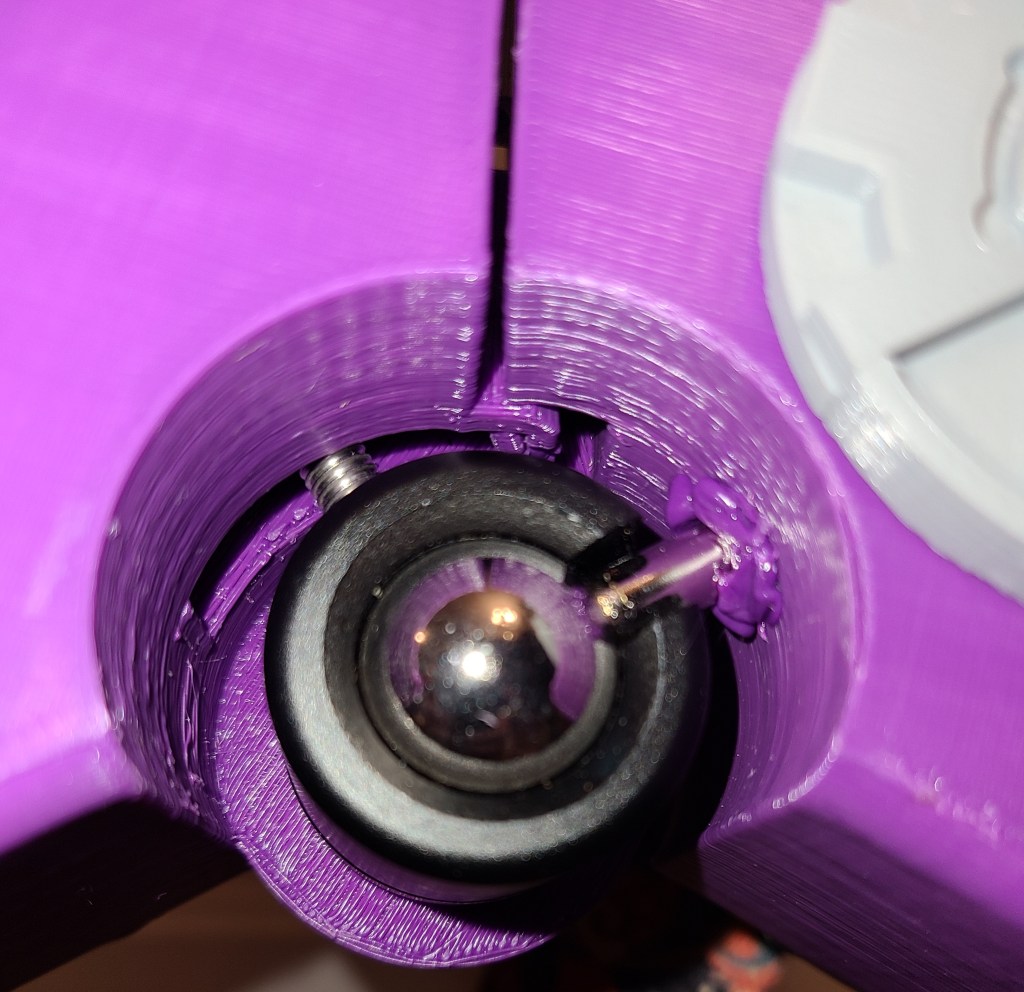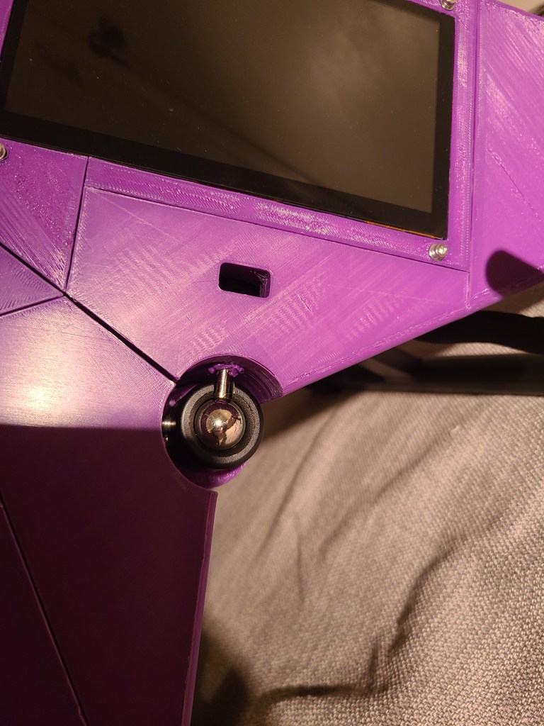 This had to be designed closely in tandem with the monitor side of this joint. This section’s purpose was to be solidly mechanically connected to the keyboard half, and hold the ball joint connecting the two halves together. There’s a space for a screw on the bottom to attach the ball joint, and a space and end-stop for a bold sticking out of the side of the ball joint. An accident after assembly caused the bolt to break straight through the end stop. Conveniently, I had recently added a 3D printing pen to my arsenal, and rebuilt the stop by hand in the same plastic… just much denser than it had been when it was originally printed.