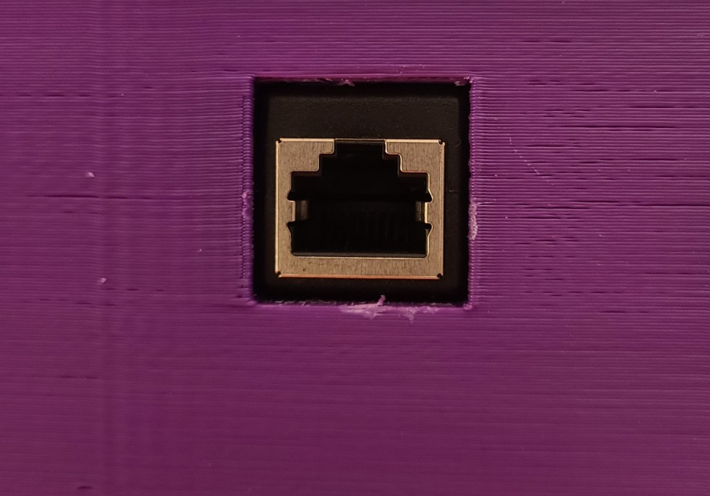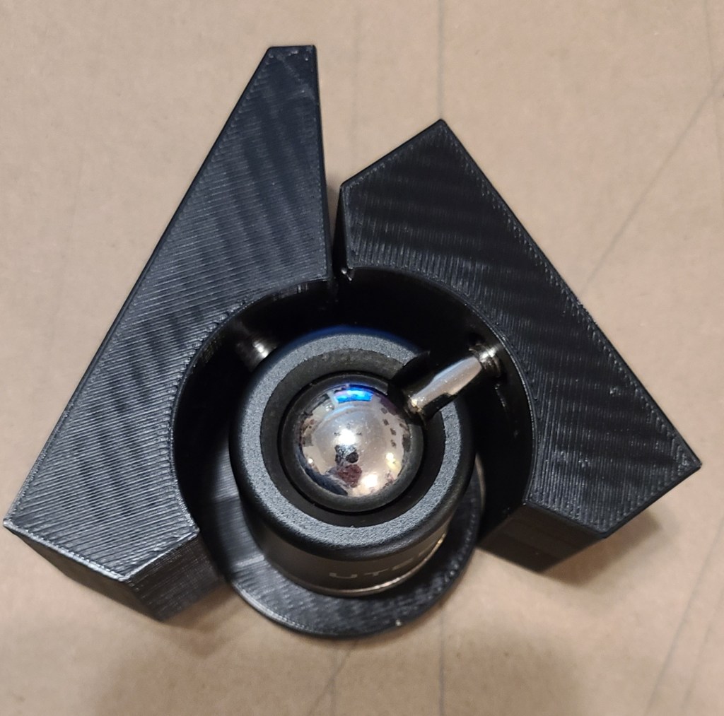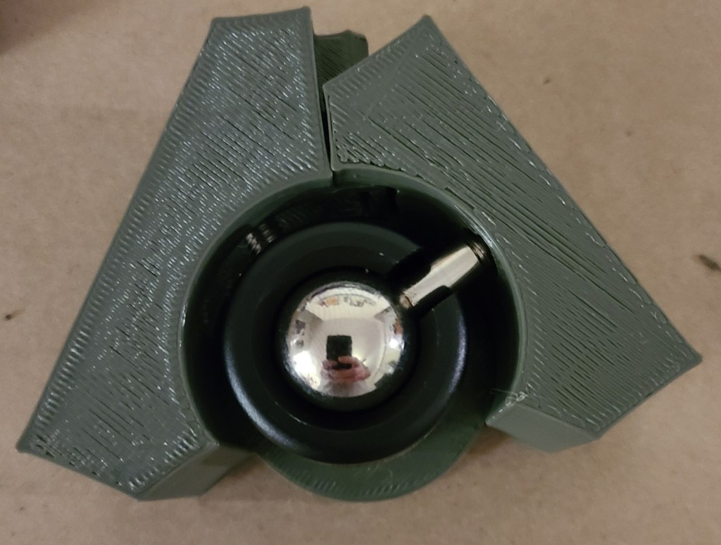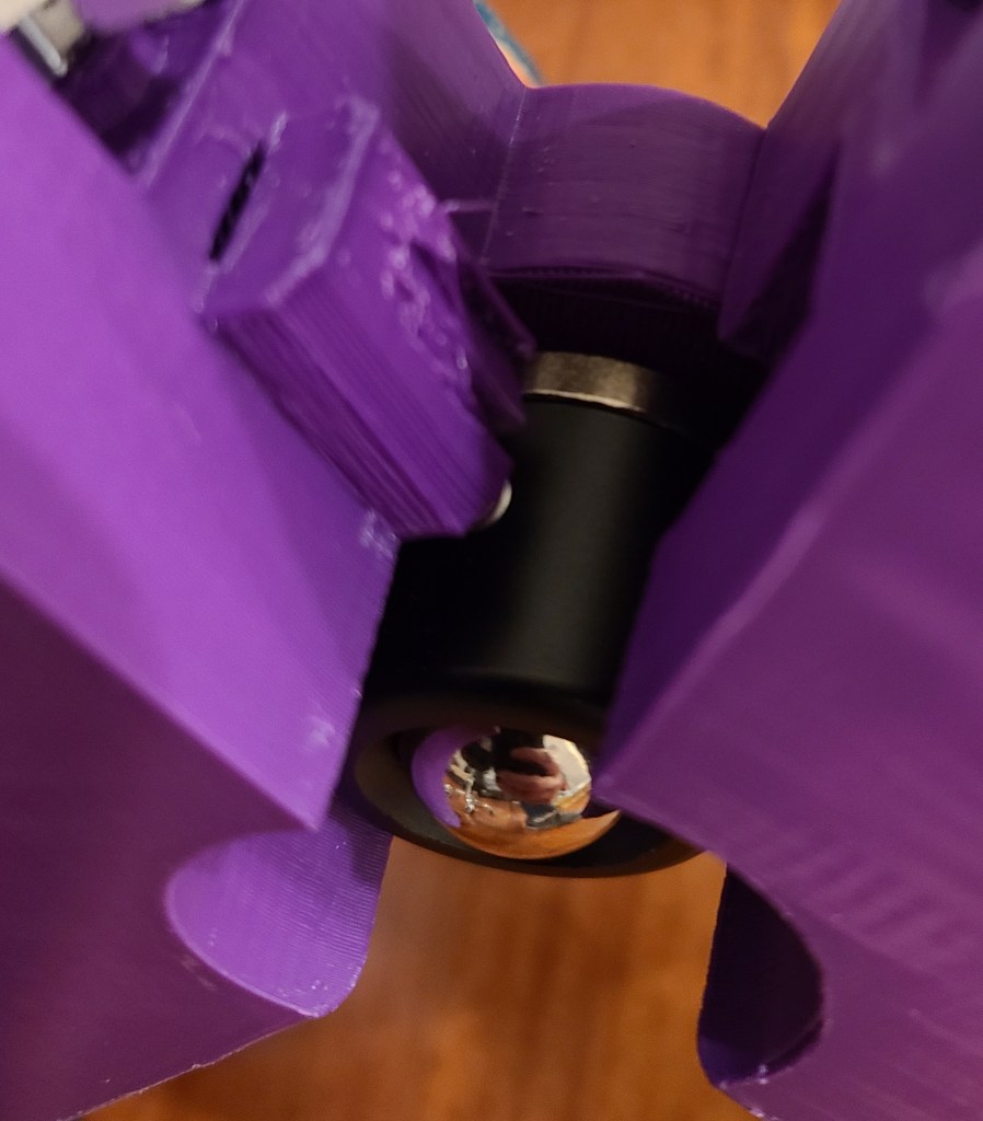 This had to be designed closely in tandem with the monitor side of this joint. This section’s purpose was to be solidly mechanically connected to the keyboard half, and hold the ball joint connecting the two halves together. There’s a space for a screw on the bottom to attach the ball joint, and a space and end-stop for a bold sticking out of the side of the ball joint. An accident after assembly caused the bolt to break straight through the end stop. Conveniently, I had recently added a 3D printing pen to my arsenal, and rebuilt the stop by hand in the same plastic… just much denser than it had been when it was originally printed.
