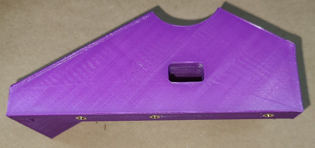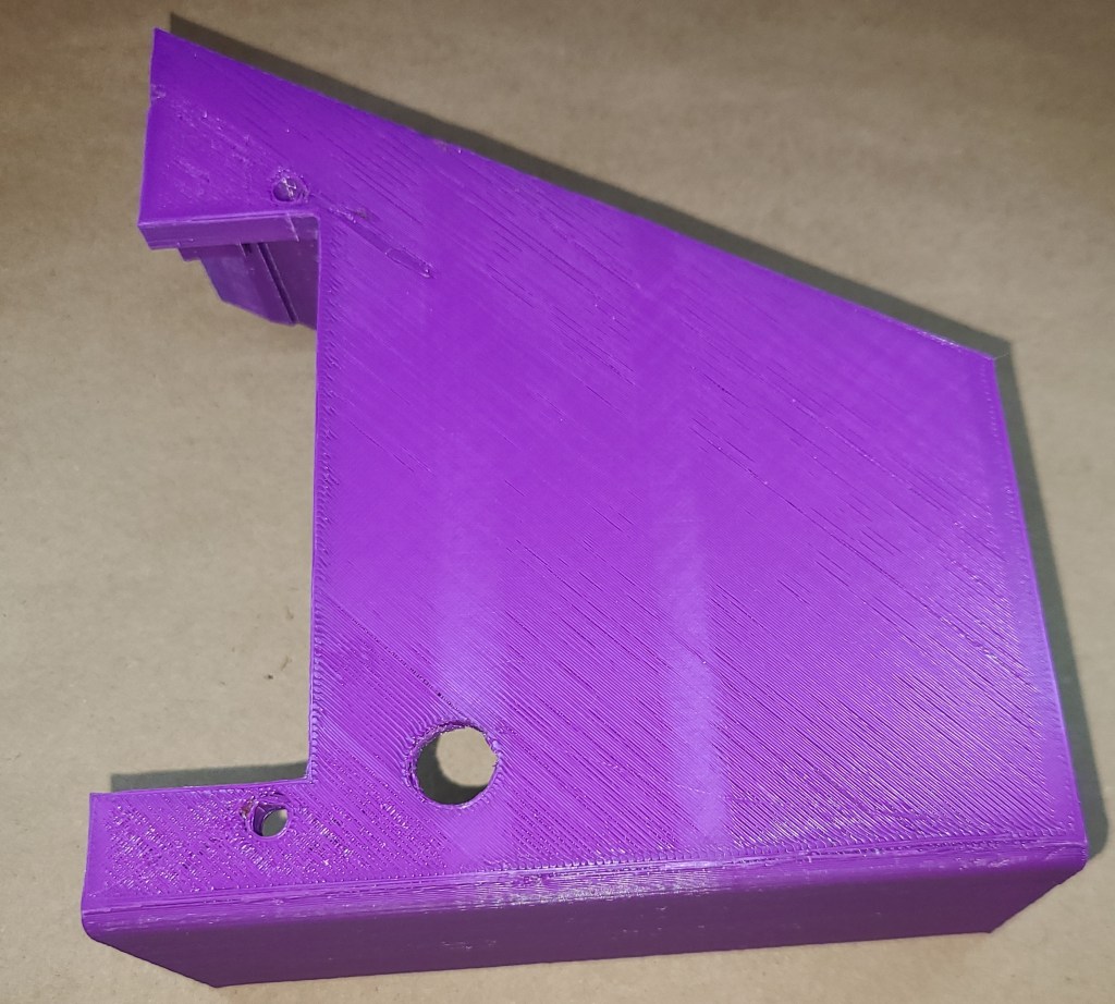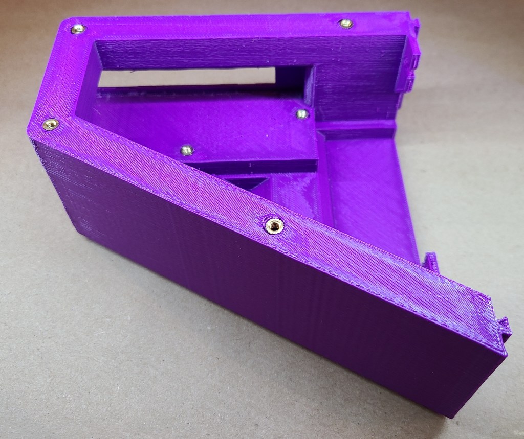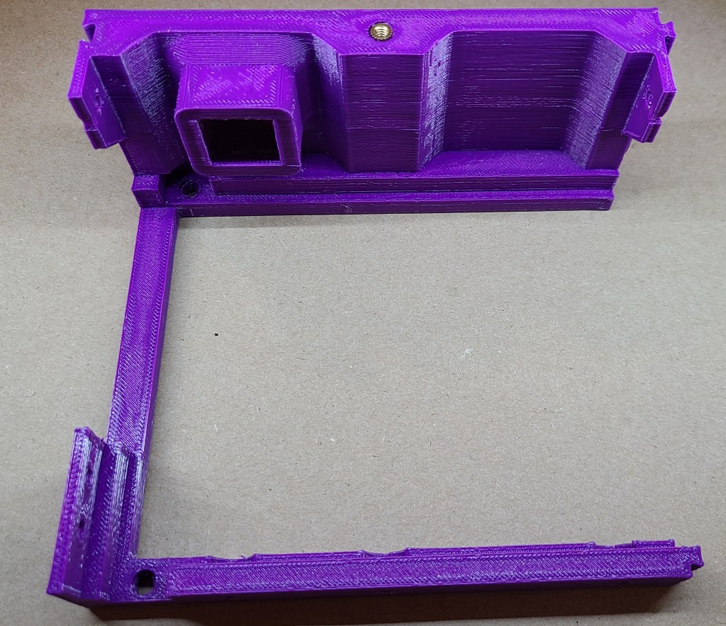 This section has the slot for the battery pack, one side of the mounting holes for the Raspberry Pi mount, a hole for the power switch, and part of the space and connections for the monitor. There is also an extended gap and mounting holes in the section near the 2020 extrusion, where I later installed a metal strap to rigidize the connection between this section and the hinge. Without that strap that connection would have been far too weak.