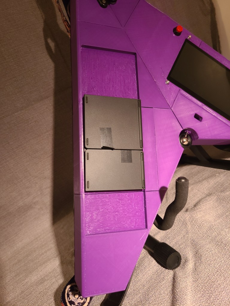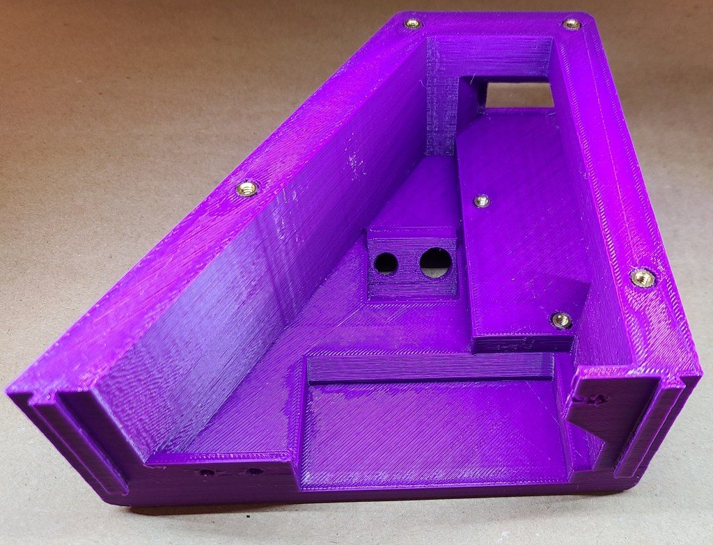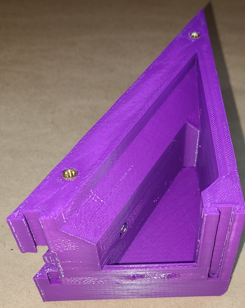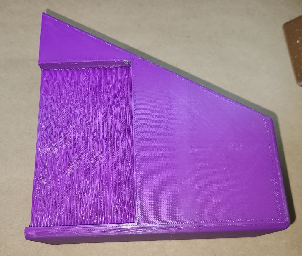 This section has the slot for the battery pack, one side of the mounting holes for the Raspberry Pi mount, a hole for the power switch, and part of the space and connections for the monitor. There is also an extended gap and mounting holes in the section near the 2020 extrusion, where I later installed a metal strap to rigidize the connection between this section and the hinge. Without that strap that connection would have been far too weak.