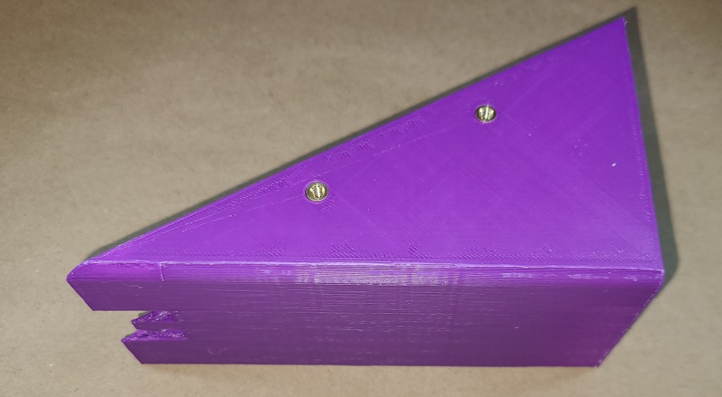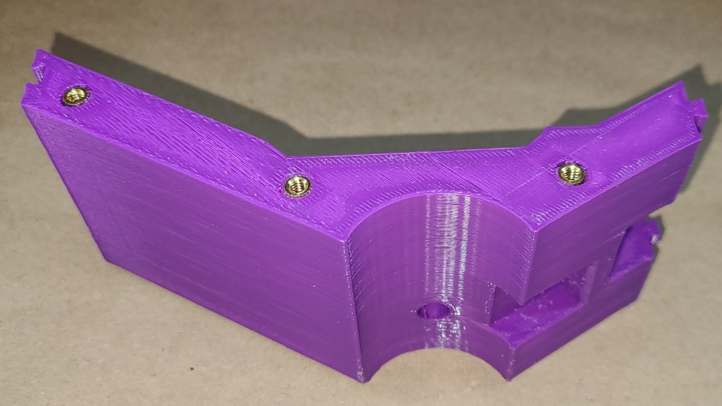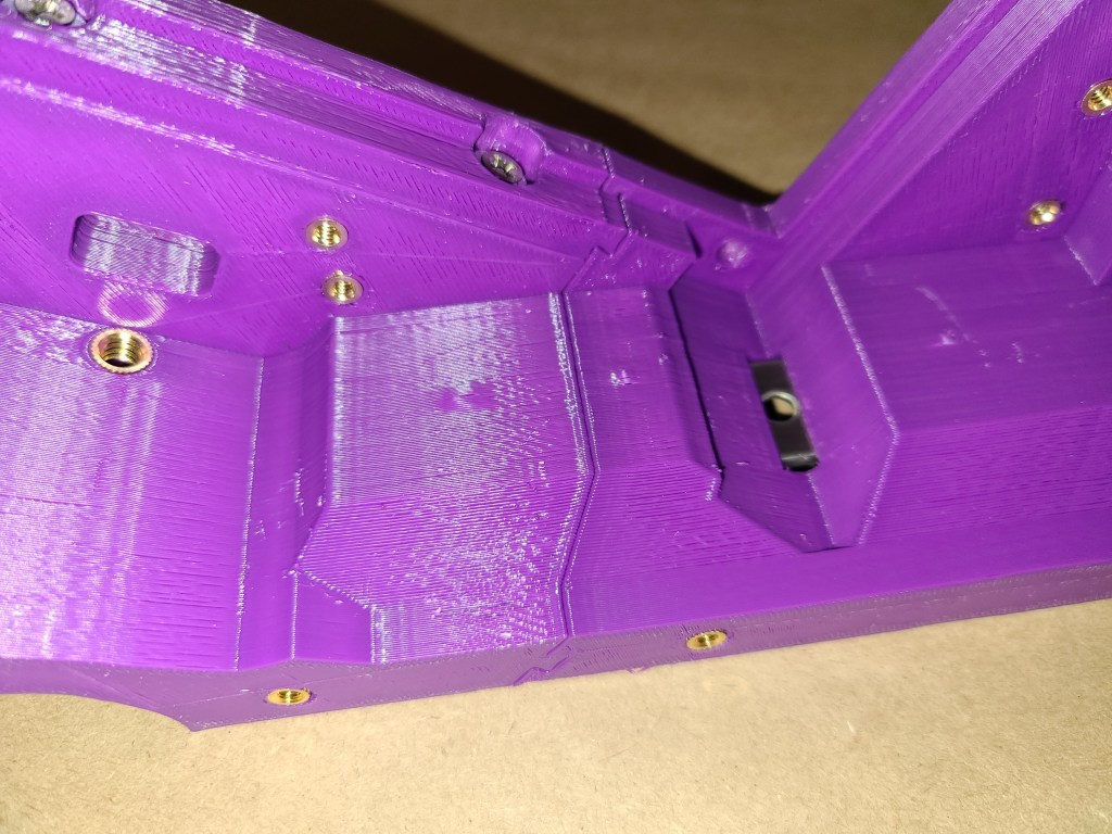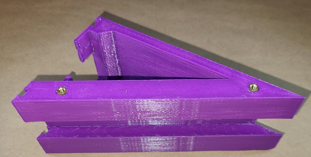 I had designed the connections with adjacent sections as I was going along. This took a couple iterations to get close enough, but as previously mentioned, the bolt broke through the end stop, which I repaired with a 3D printing pen. I also had some difficulties with the screw going into the monitor joint. I appear to have made the hole for the heat set insert slightly too large and it slipped around. 3D printing pen to the rescue again! I covered the back of the screw and filled the area around the screw with plastic.