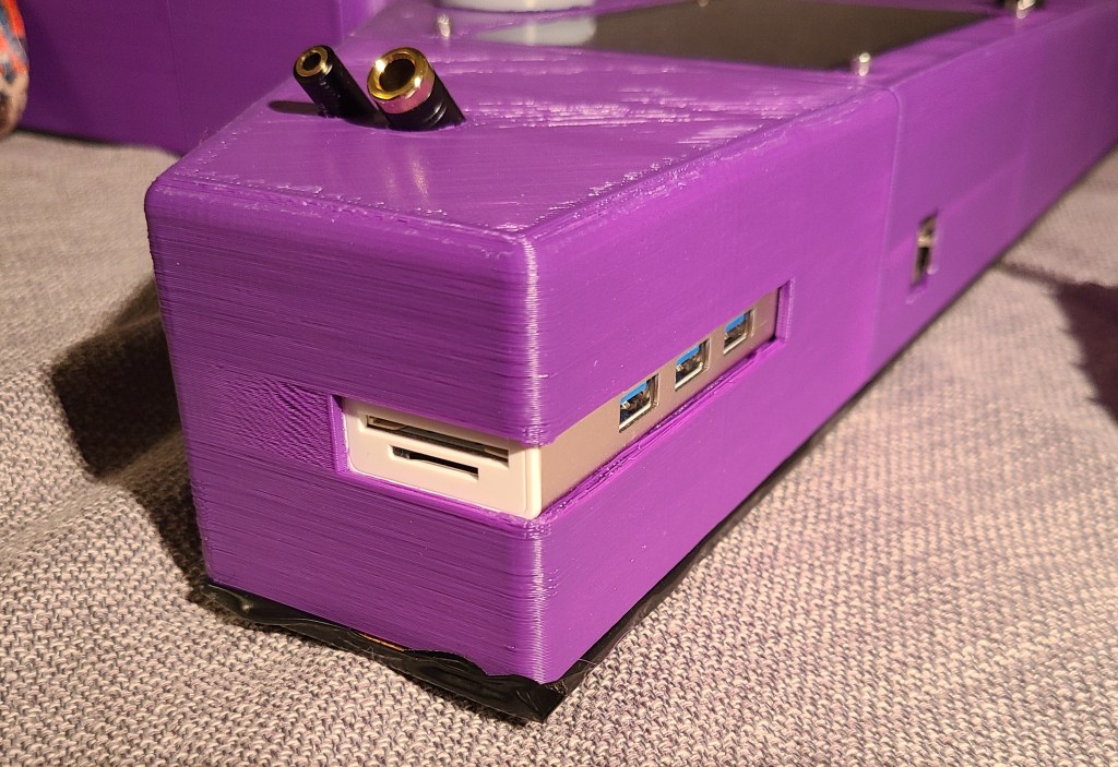 Some parts were hot glued into place, as I can remove hot glue with a bit of effort if I need to make modifications later. Also, it allowed me to get away with not having positive retention on the audio jacks, which would have been a pain to implement on the short timescale I had available.