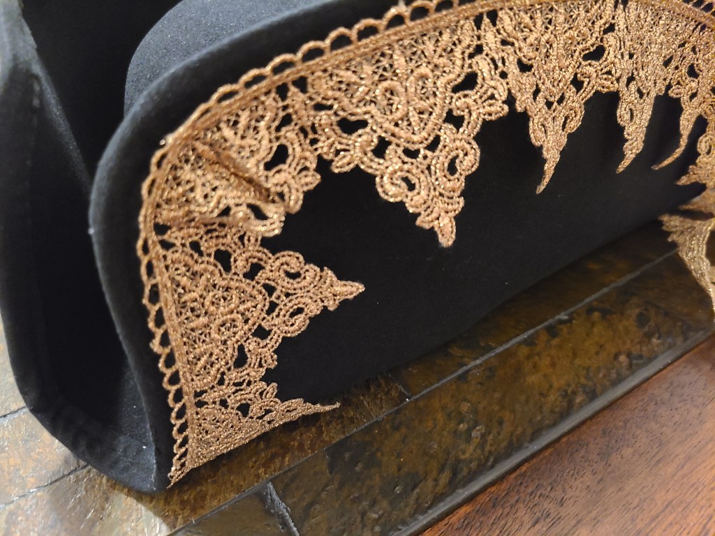 I started brushing on felt glue on the back of the lace, and pinning it into place so that I wouldn’t have to worry about curling or stretching or anything like that.