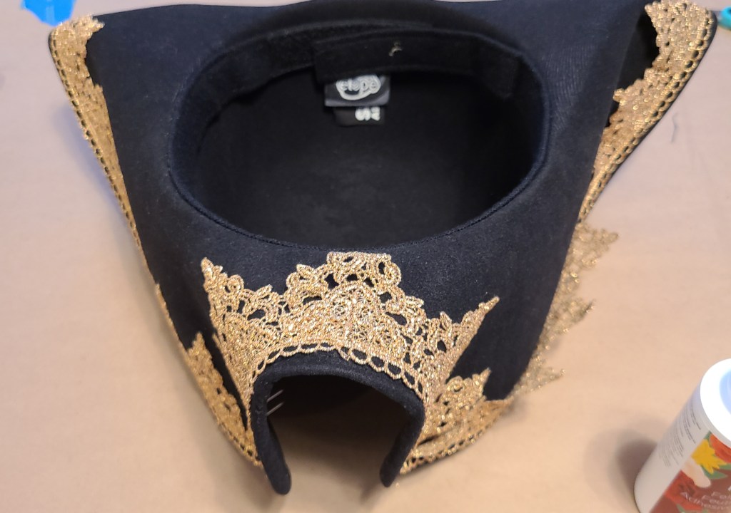 To start with I took the hat, and cut and sewed the gold trim on along the edge, using the gold thread to hide the stitching.