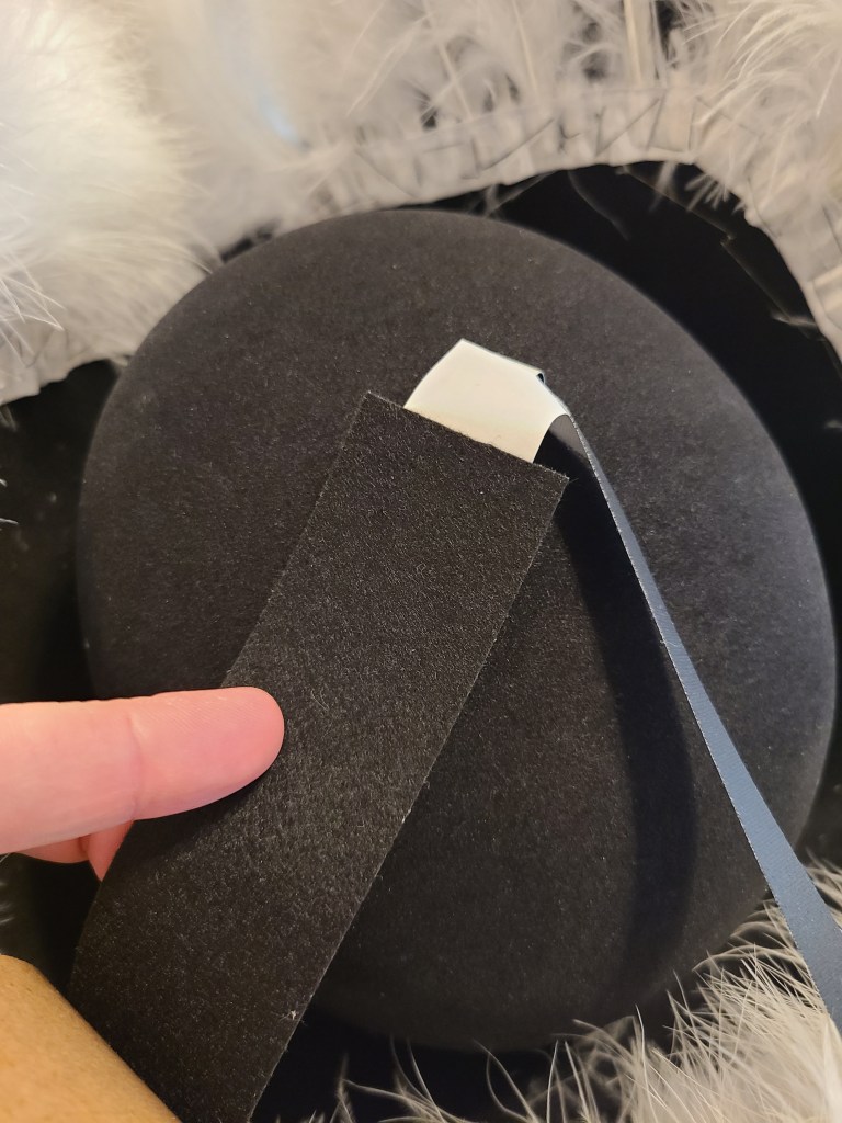 At this point, you’re going to want to use a little bit of painter’s tape to get bits of feather out of the inside of the hat. DO NOT use the lint roller for in there, you will catch it on the feathers that you want to stay on the hat. You may also want to run the lint roller on the outside of the hat.
