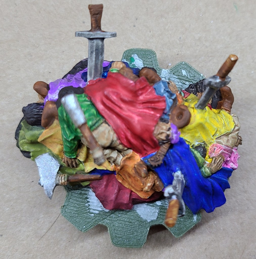 I decided to paint a few minis again. I’m hoping to print some minis for a game of Shadowrun soon, so while I’ve been tinkering with the printer I’ve been painting a few small things. A couple of minis that wouldn’t be out of place in-genre, and the Mound of Dead Bards from Gamers: Dorkness Rising. That last one took quite a bit of work.