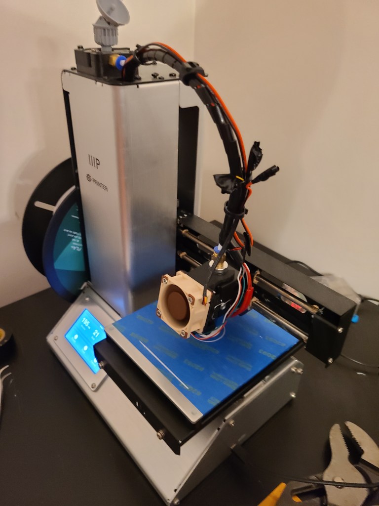 I’ve so far never managed to get the Monoprice Select Mini Pro to print minis as nicely as the other printer. I’ve been tinkering with some settings, and also with the hardware. Main thing I want to change is to improve the part cooling. I’ve gone through a couple iterations of air vent modifications and swapping in a better fan, but I really think it needs 2 fans. Unfortunately all the designs I see that include 2 fans are for different configurations or models, so I’m having to do some model splicing and editing. The main issue I come across is that the bed levelling/z axis sensor is mounted in a specific location not present on earlier versions of the MPSM, so I’m having to carefully splice that mount in in a way that is compatible with the air mods. I’m also doing a bit of experimentation with freehand modifications with the 3d printing pen, but the improvement has not been significant.
