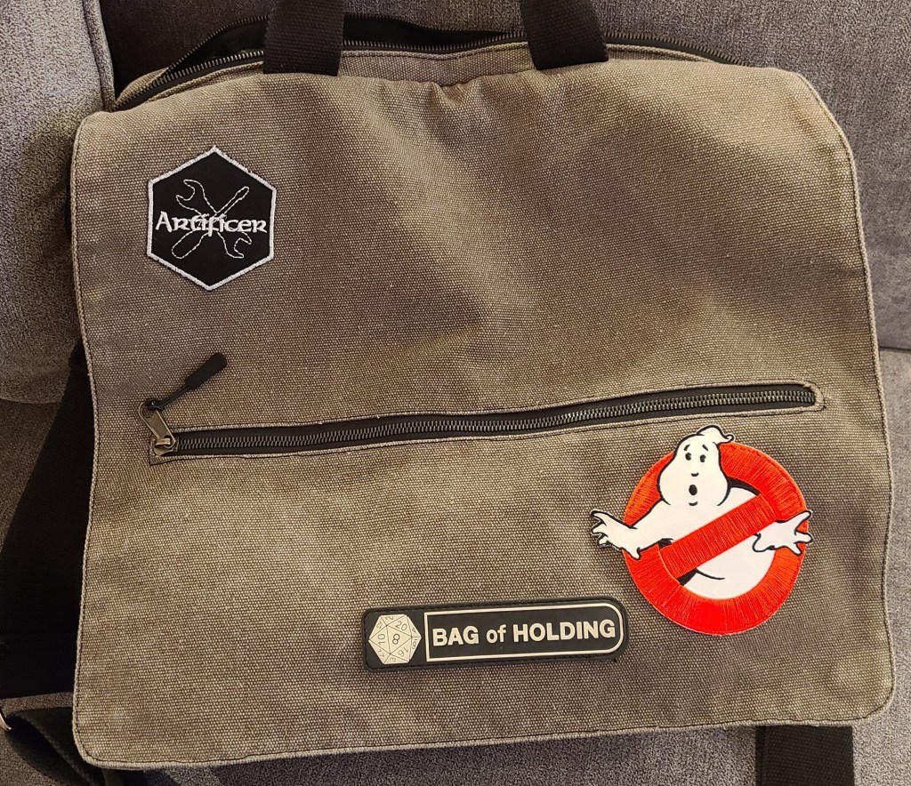 I’ve had a bag of holding from Thinkgeek for years. Used it in my college days until I overloaded it with weight and damaged it beyond my ability to repair at the time. I’ve carried it with me from place to place, and occasionally used it (with some safety pins over a busted zipper or two) for thematic appropriateness or something “close enough”.