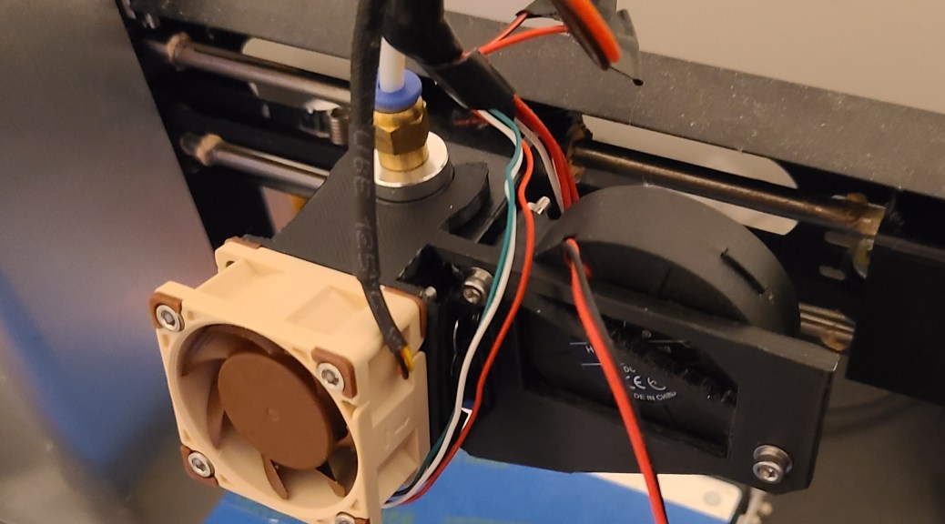 I’ve been splicing various premade models designed for previous generations of the Monoprice Select Mini into one that allows for a better hotend fan and a part cooling fan.