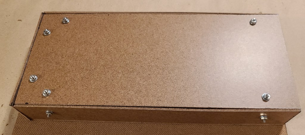 This material is flimsy, and I would think particularly prone to fire and/or melting. I decided to make a better box with some stronger materials (hardboard and metal hardware). This would double as practice with hardboard, which I had never used before but planned to use in the Flying V. I thought I could knock it out as a one day build.