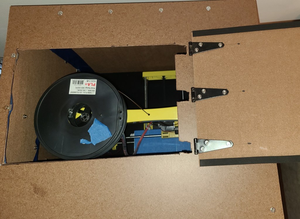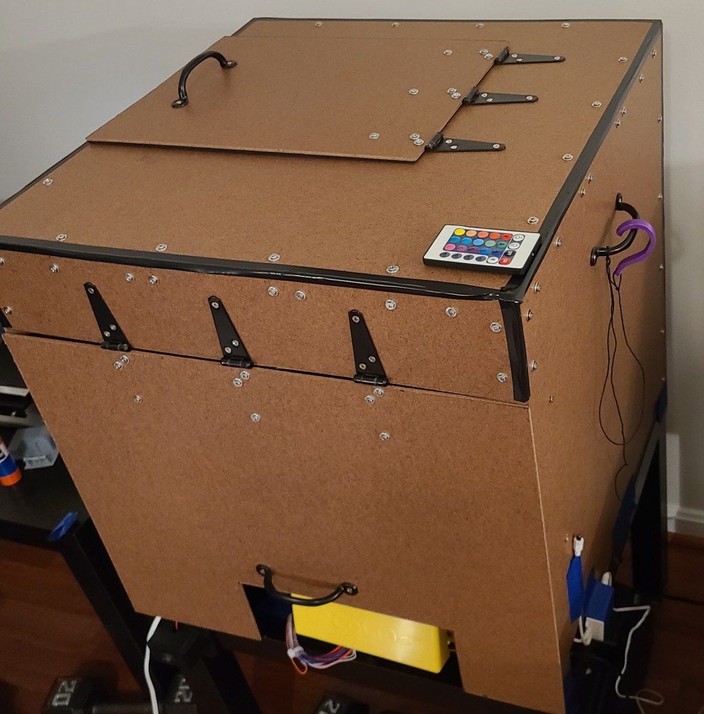 Notes for future development on this box: I still intend (when the weather is better) to partially disassemble the box (mostly just take the lights out), and paint at least the inside (but probably also the outside) with a fire-resistant spray paint. This will help ease my paranoia of 3D printer fires while also minimizing fiber shedding on the inside of the box. Also need to fill the gaps at the corners with something.