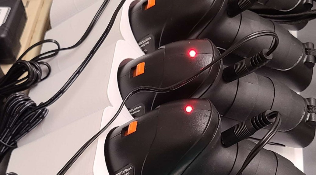 In my classroom I have several Warrior electric screwdrivers from Harbor Freight, and I got annoyed with laying them down on the counter to charge. It’s cluttering and frustrating, so I designed and printed some stands that link together.