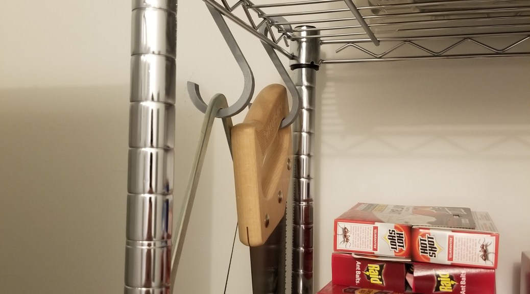 And for a random yet practical use of 3D printing: S-hooks for hanging tools up. I needed to get my saws out of the way, and I realized I had a place to hang them up… as long as I had something to hang them up with. S-hooks seemed like what I needed, so I did a quick search and printed a couple out. Now the saws are (reasonably) safely stored out of the way.