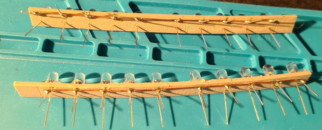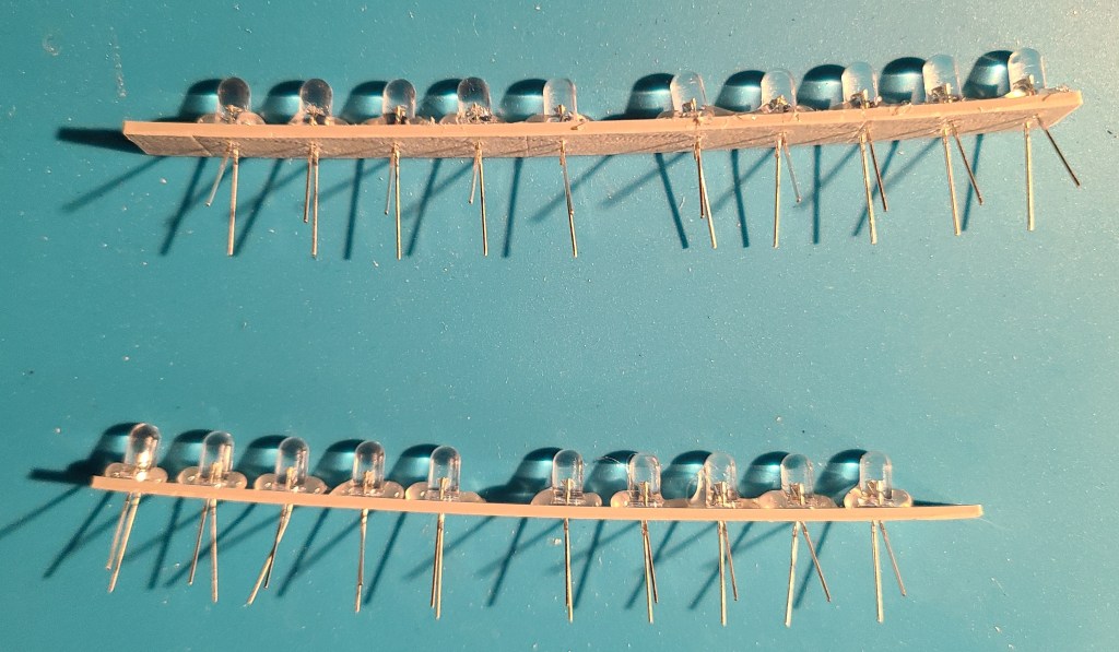 To avoid going insane with trying to glue in each LED and try to solder all the connections with reasonable spacing, I designed and printed spacers that I could simply stick the wires of the LEDs through. I think the wires would have held, but to make things simpler on myself (and so they wouldn’t push out during soldering) I hot glued them after putting them in.