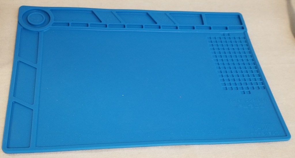 This silicone mat prevents the hot solder droplets from hitting the work surface, so that it doesn’t get scarred or ignite anything.