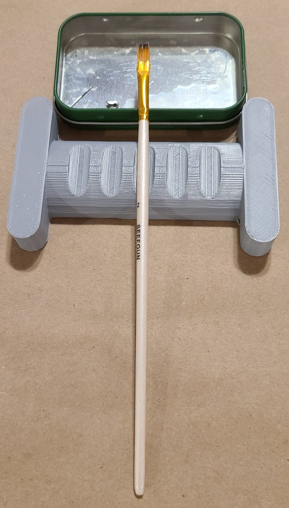 This brush stand is for brushes drying during or after I’m painting. The tin catches any potential dripping, the 3D printed piece keeps the brushes from rolling, and the pin is for unclogging paint dropper bottles.