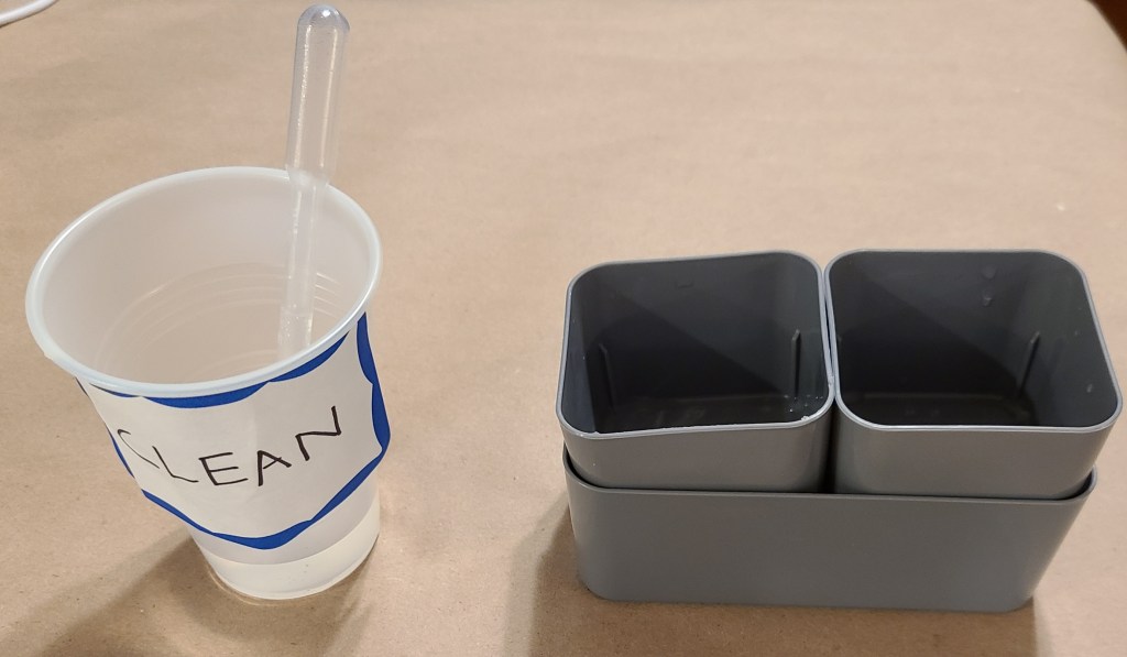I have three containers of water. One is NEVER dipped in except with a dropper, for thinning paints into washes. The other two are my primary and secondary rinse cups. The primary gets the majority of the paint off, the secondary gets more off (principles of diffusion). I chose the rinse cups the way I did in order to minimize the risk of tipping them over.