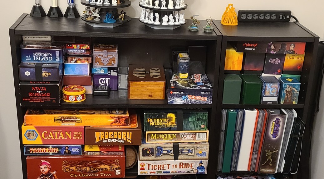 For those who are interested, here is my collection of tabletop games. For a sample of how some of them play, I’ve included links to the relevant Tabletop episodes that cover the rules and shows people playing it (again, not sponsored, but I like the show and it gives you the gist of these games).