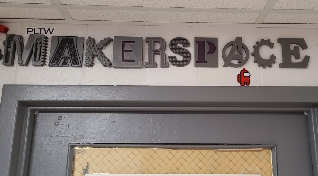This took a little bit of searching and a couple days or so of printing, but I decided to make my classroom’s makerspace sign more interesting. I removed the wooden letters and replaced them with 3D printed letters. The reason it took a bit of searching was because I wanted every letter to be a different style than all the others, just to show some different things that 3D printing could do, and inspire thoughts of different things that could be made.